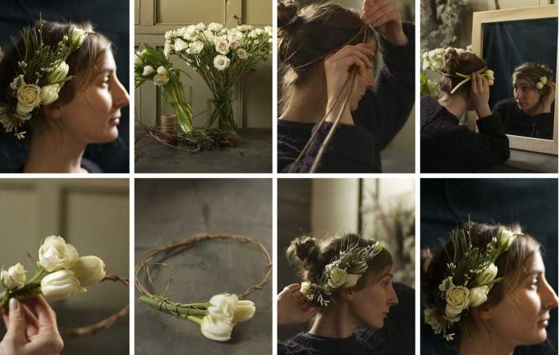 Для создания украшения на голову нужен каркас из проволоки в форме кольца. Его надо замотать плотно лентой. Лучше выбрать зелёный цвет, чтобы явно не выделялся. Цветы, со стеблями 13-14 сантиметров в длину, кладутся на основу и фиксируются лентой по кругу. Для прочности, концы закрепляются клеем.
