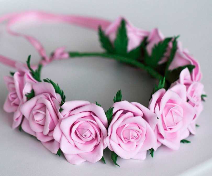В день бракосочетания достаточно популярны сегодня свадебные венки из фоамирана. Особенно, если торжество проходит на свежем воздухе, а не в помещении загса. Важно учесть, чтобы бутоны ободка перекликались с букетом.