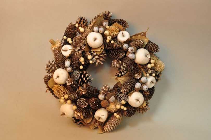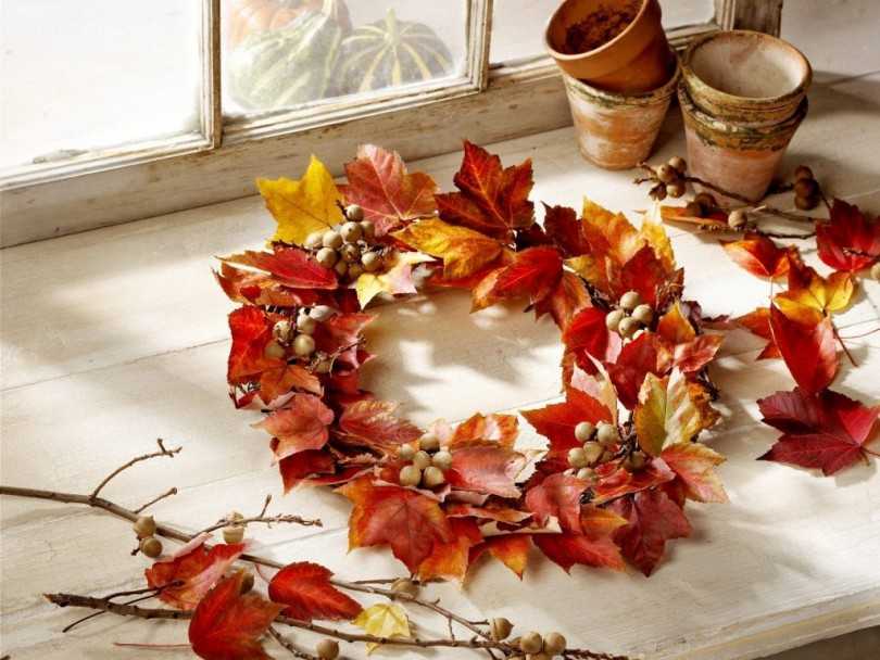 На готовый ободок из медной проволоки крепятся 5 листьев одновременно, фиксируются при помощи флористической ленты. Стебли прячутся под листья и лишние срезаются. Для индивидуальности можно добавить сосновые шишки, грозди рябины или колосья пшеницы.