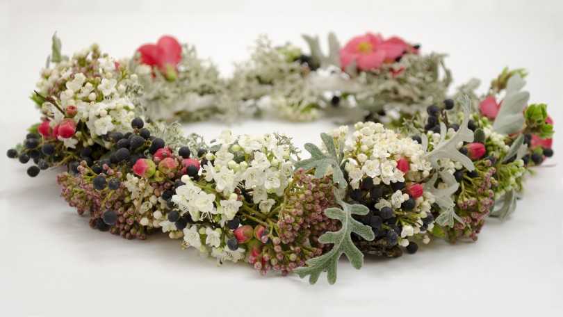 Перед тем как плести венок, нужно измерить объем головы сантиметровой лентой и создать проволочный каркас под этот размер. У каждого цветка необходимо обрезать стебель до длины в 5 см, после чего, прикладывая стебли к каркасу, обматывать их атласной или флористической лентой. Повторять это нужно, пока весь каркас не скроется под бутонами. Можно немного увеличить объем изделия, для этого цветы собираются в небольшие букеты из трех-четырех штук и только потом прикрепляются к каркасу.